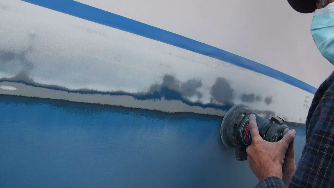 important sur Tribull à commencer par le retrait du safran pour y ajouter un point de graissage de la mèche, ajouter l'antenne island time, le nouveau chauffe-eau instantanée au propane, trouver où mettre les deux vélos pliants, reprendre la partie basse de la peinture neuve de 2010 qui à osmosé entre la couche de primer et la fine couche de blanc. Nous avions l'intention de reprendre la peinture au pistolet à air mais nous avons appris qu'il est formellement interdit de le faire sous peine d'expulsion. Nous le ferons donc au rouleau. De plus le sablage à été plus ardu car on a découvert que la très vieille ligne bleu de 2003 était toujours en place sous la couche de primer. |