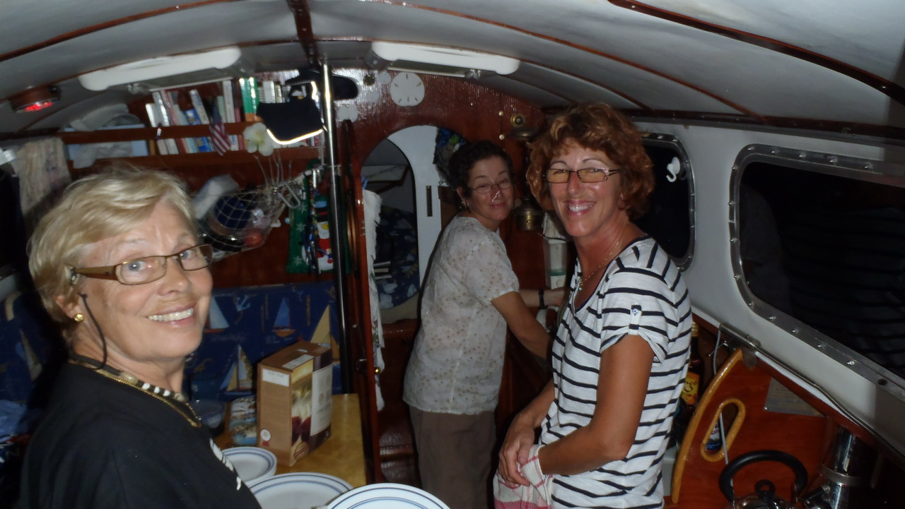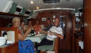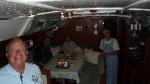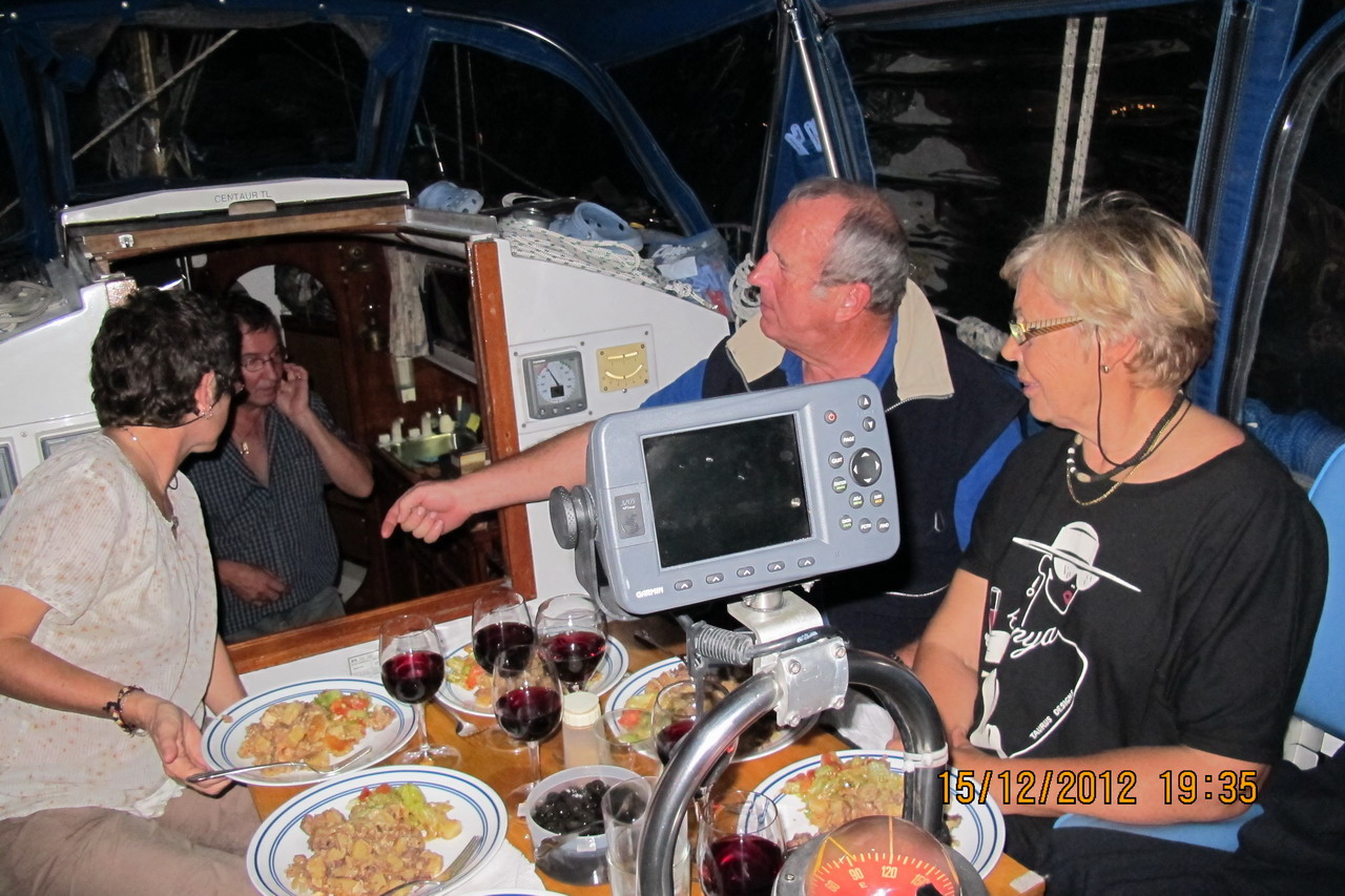 décembre c'est le temps du réveillon de Noël qui se déroulera sur Sandy II en compagnie de nos compagnons de route. Donc dans l'ordre habituel; Sylvain, Claude, Sylvie, Louise, Jean-Claude et Lucie. Au menu, gigot d'agneau, paté à la viande, légumes et tarte au fromage et cerise... |