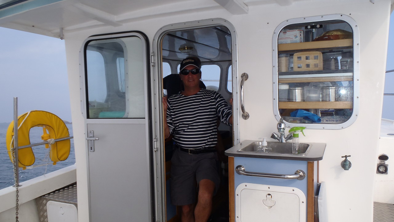 | 2014-09-07 _/)_ ~ Aujourd'hui en nous rendant au port pour une croisière sur le bateau de pêche de Philippe et Soisic le Tamaroa, un KingFicher de 31 pieds, nous avons croisés le parcours du Rally de St-Malo ou plus de 3000 participants y sont inscrit cette année. Rendu au bateau, nous quittons vers 10h50 vers les îles des Ehbiens et plus principalement vers le haut fond de Saint-Jacut de la Mer et des Ébihens. Au départ, sur les quais du port de plaisance, plusieurs voiliers se prépare pour la course du jour. ~ _(\_ |