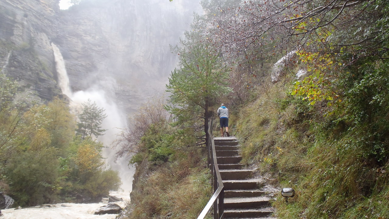 une immense cascade, nous faisons alors demi tour, il est 16h00. Wow, elle coule en ta-boire, il sagit de la cascade de Sorrosal qui est le fruit d'un glacier de la dernière période glacière et de l'eau d'un fleuve, vous pouvez lire les explications plus exaustives sur les deux planches. ~ _(\_ |