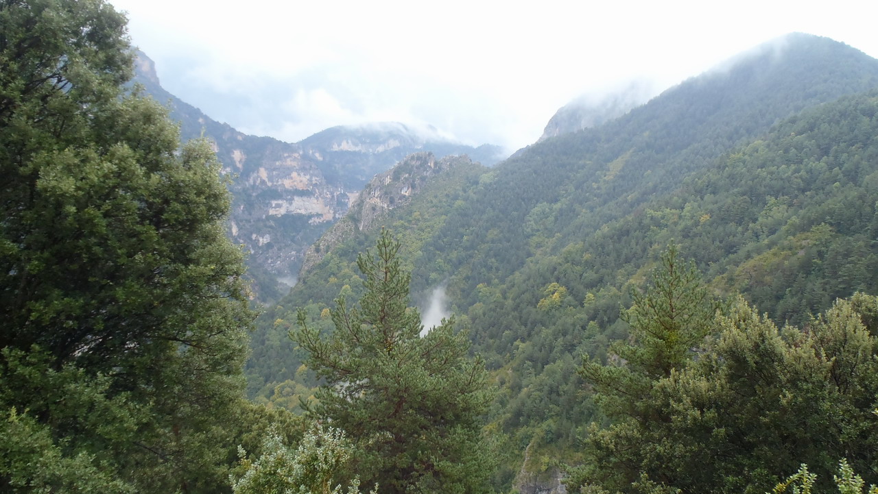 qui nous conduira vers Torla à plus de 35km par une route tortueuse à sens unique sous des averses constantes occasionnant par endroit des éboulis de pierres qu'on espère ne pas recevoir sur notre bagnole. Nous arrêterons quelques instants pour observer les moutons et au kiosque Oficina de turismo de Cabillos qui sera fermé. Nous reprendrons la route super tortueuse affiché à 30km/h allez donc savoir pourquoi ??? ~ _(\_ |