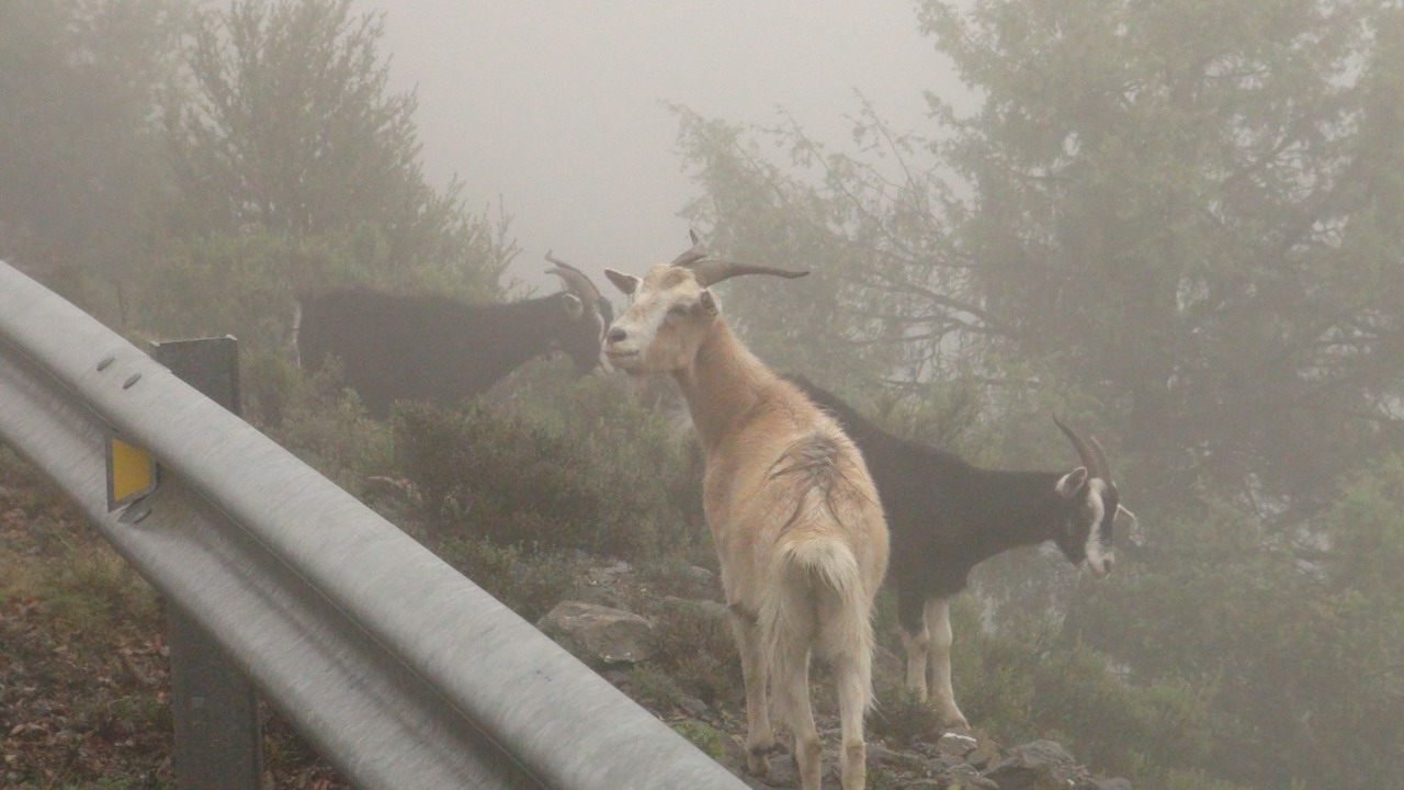 qui nous conduira vers Torla à plus de 35km par une route tortueuse à sens unique (qu'on savaient pas a sens unique, on pensaient croiser des voitures) sous des averses constantes occasionnant par endroit des éboulis de pierres qu'on espère ne pas recevoir sur notre bagnole. Nous arrêterons quelques instants pour observer les moutons et au kiosque Oficina de turismo de Cabillos qui sera fermé. Nous reprendrons la route super tortueuse affiché à 30km/h allez donc savoir pourquoi ??? ~ _(\_ |