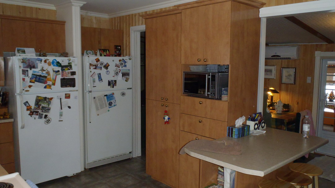 | Printemps 2015 Retirer les portes patios intérieures et refaire une porte coulissante pour entrer dans la chambre et un mur entre le salon et la chambre. Ajouter un comptoir lunch, une extension de comptoir pour la cafetière et une cuisinière 5 feux au Gaz Propane |