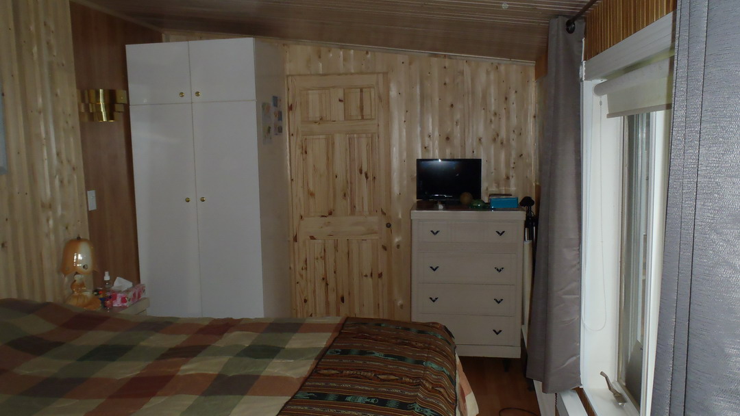 | Mai 2015 Réfection d'une partie du mur nord pour y retirer la porte patio et la fenêtre pour refaire l'isolation, un rejet de toiture et remettre une plus petite fenêtre, faire un garde robe à l'intérieur de la grande chambre à partir de la porte récupérer de la petite chambre et y transférer l'une des deux armoires blanches. |