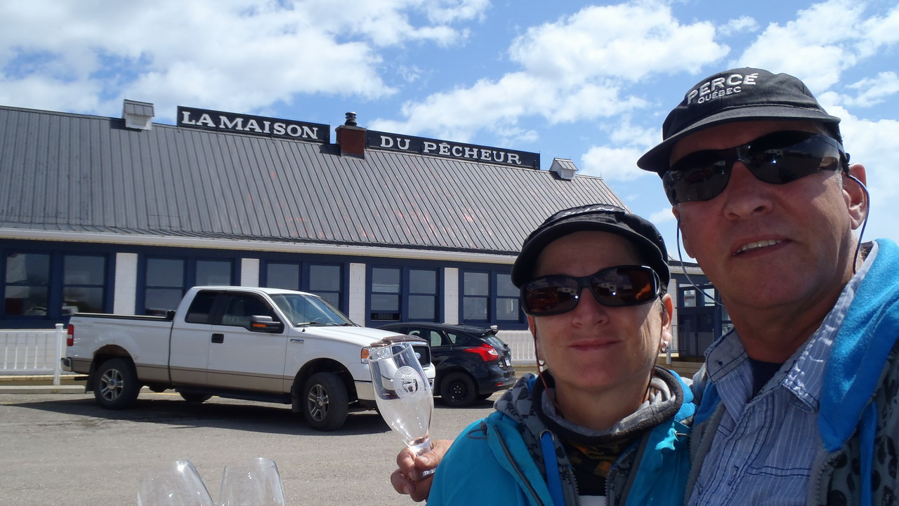 devant la brasserie Pit Caribou sur le bord de la baie de Gaspé et de l'océan atlantique ... mais au préalable nous irons faire un titour à Gaspé pour y visiter le village et aussi pour y voir la fameuse Maison du Pêcheur qui a vue le jour dans les années 1968 alors que Paul et Jacques Rose avec leur amis Francis Simard ont demeurés dans cette cabane avant de se faire connaitre un peu plus avec les évènements d'octobre. |